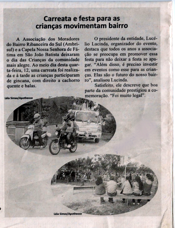 Nesta segunda -feira(17) recebemos em nossa redação o presidente da Ambrisul e Capela NSª de Fátima em Ribanceira do Sul que veio perguntar a respeito de uma matéria no Jornal Correio Catarinense , onde constava o nome Léia Simas-Apotheoze, sobre o evento realizado no dia 12 em comemoração ao dia da Padroeira do Brasil e gincana para as crianças. Visivelmente entristecido pois disse que o acontecido não recebeu a devida atenção sendo registrado na matéria um conteúdo superficial e com texto primário , já que o evento foi prestigiado por um número expressivo de pessoas .